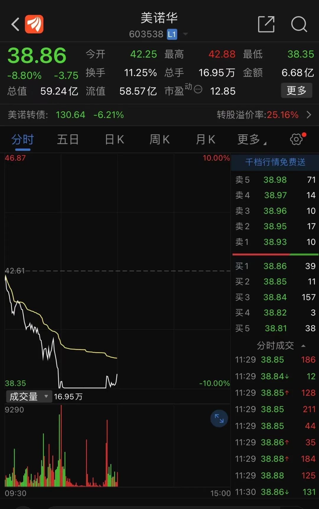 随着消息发出,美诺华股价也瞬间跌停。不过,临近午盘,美诺华打开跌停板,截至午间收盘,股价下跌8.8%。