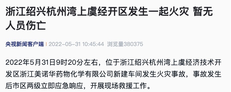 据央视新闻消息,2022年5月31日9时20分左右,位于浙江绍兴杭州湾上虞经济技术开发区浙江美诺华药物化学有限公司新建车间发生火灾事故,事故发生后市区两级立即应急响应,开展现场救援工作。据初步调查,为有机溶剂引发火灾。据现场核查,没有人员被困、没有人员伤亡。