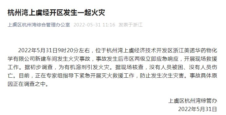 据上虞区杭州湾综合管理办公室官方微信号最新消息,2022年5月31日9时20分左右,位于杭州湾上虞经济技术开发区浙江美诺华药物化学有限公司新建车间发生火灾事故,事故发生后市区两级立即应急响应,开展现场救援工作。据初步调查,为有机溶剂引发火灾。据现场核查,没有人员被困、没有人员伤亡。目前,正在专家组指导下紧急开展灭火救援工作,防止发生次生灾害。事故具体原因正在调查之中。