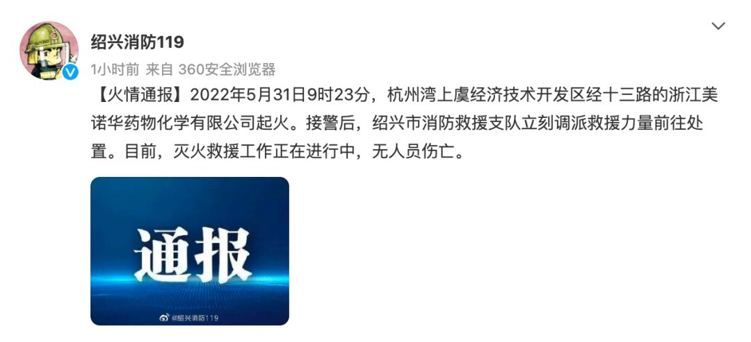 随后,据绍兴消防发布,2022年5月31日9时23分,杭州湾上虞经济技术开发区经十三路的浙江美诺华药物化学有限公司起火。接警后,绍兴市消防救援支队立刻调派救援力量前往处置。目前,灭火救援工作正在进行中,无人员伤亡。